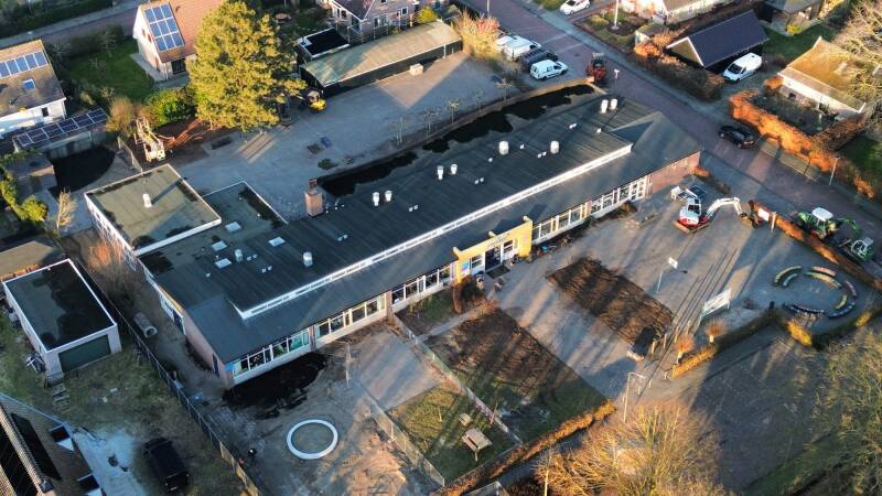 Aan de voorzijde is een prachtige ronde zandbak aangelegd. Een echte blikvanger! Maar wat je niet direct ziet, is al het grondwerk dat is verzet en de elektra die is aangebracht. Achter de schermen is minstens zo hard gewerkt. De nieuwe contouren van het plein worden steeds beter zichtbaar… en het wordt écht mooi!